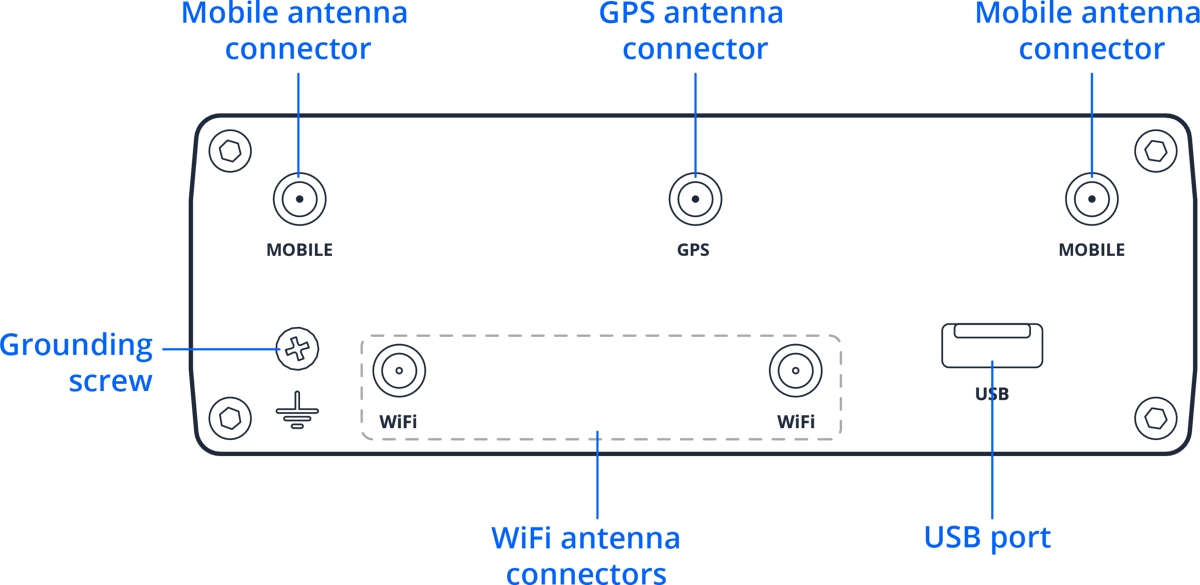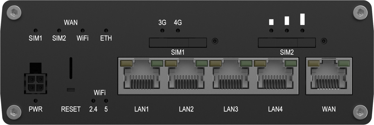 The router is equipped with a modem supporting 4G LTE Cat. 6 and 3G, with data rates of up to 300Mbps downlink and 50Mbps uplink. Power can be supplied via the 4-pin DC connector (9-50 V) or passive PoE (9-50 V) on the LAN1 port.
