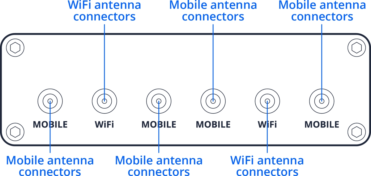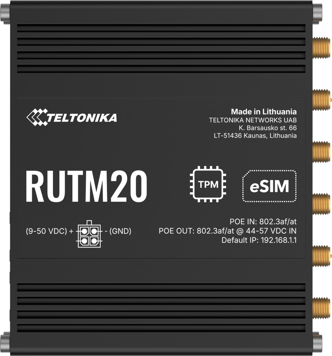 The Teltonika RUTM20 is an industrial 5G Wi-Fi 5 router with (2) 1Gbit ports (LAN + configurable LAN/WAN), dual-band Wi-Fi 5 operating simultaneously in the 2.4GHz and 5GHz bands, delivering throughput of up to 1.17Gbps, (4) SMA female connectors for external 5G antennas, (2) RP-SMA female connectors for external Wi-Fi antennas, (2) mini SIM slots and eSIM support.