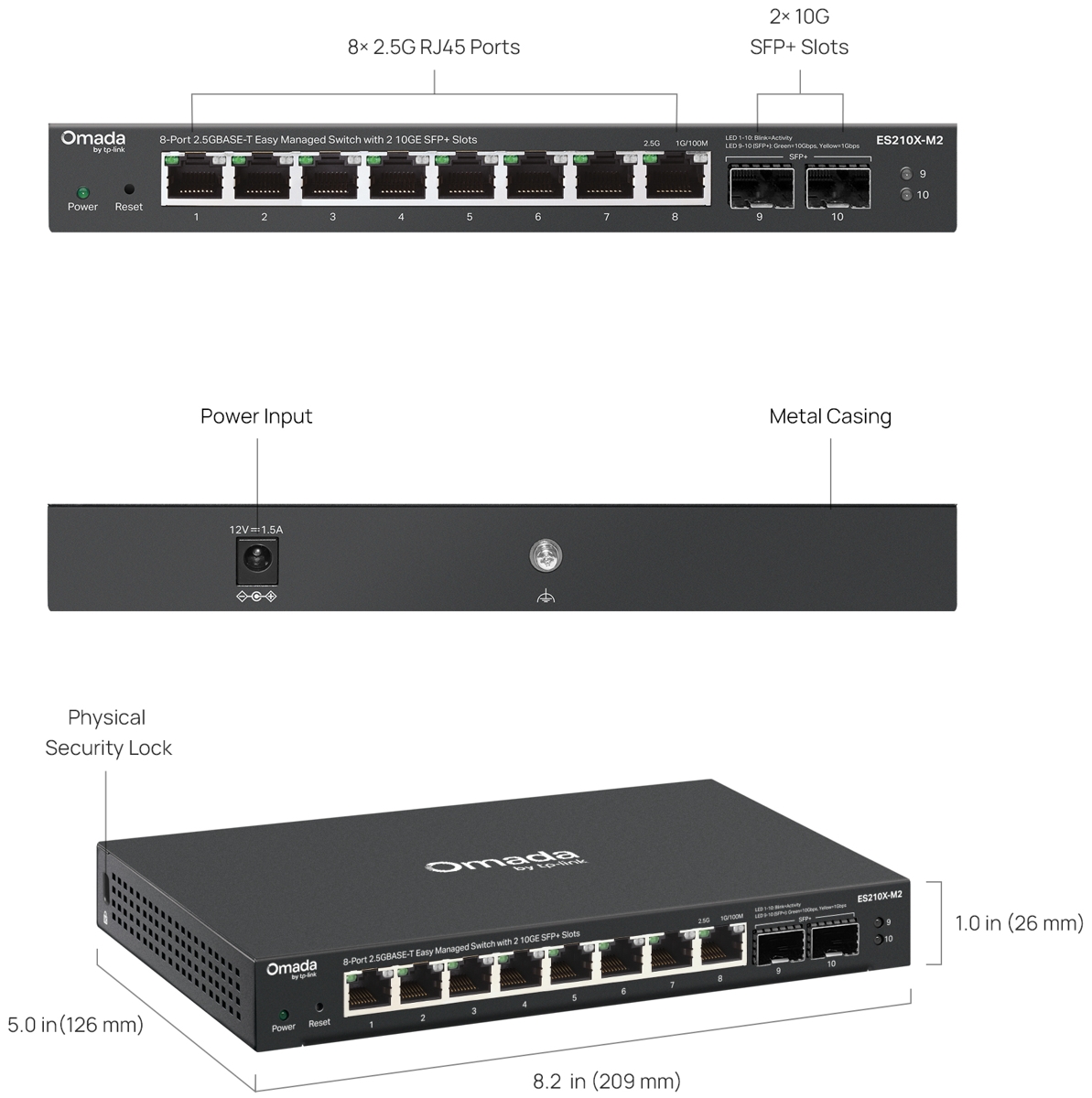 TP-Link ES210X-M2 is an Omada Easy Managed 2.5G switch with a switching capacity of 80Gbps, (8) 2.5G ports and (2) SFP+ slots. It supports management via a local web interface and cloud management. The maximum power consumption of the device is 8.4W.