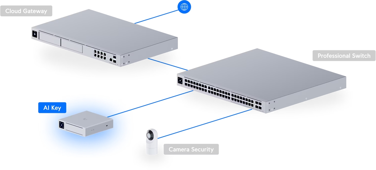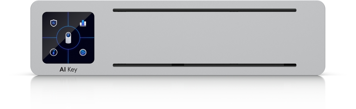The Ubiquiti UniFi AI Key is an advanced edge AI appliance designed to elevate your UniFi Protect security system. It enhances detection capabilities with powerful features like NeXT AI natural language search, AI alerts, speech transcription and image enhancement. It features (1) 1Gbit PoE++ In port and an intuitive display. AI Key adds face and license plate recognition for Protect G4/G5 cameras with higher capacity than AI Port and can process up to 1000 smart detections per hour. However, AI Port offers real-time processing, while AI Key results depend on the queue length.