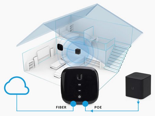 UFiber Active Ethernet provides fiber connectivity to an RJ45 Ethernet device, which in turn provides 802.3af or 24V passive PoE to UFiber AE.