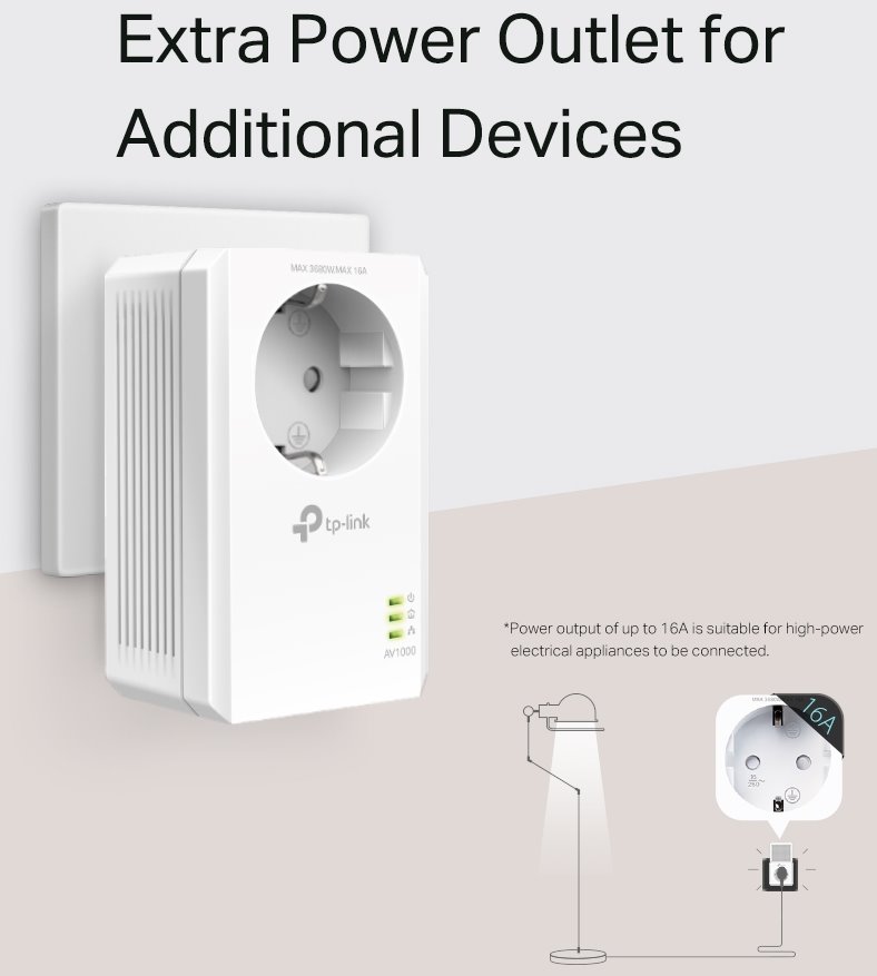 Finding it hard to plug in your devices? The TL-PA7017P KIT has an integrated AC pass-through power socket. Your powerline adapter can now be used like a traditional electrical outlet. Plug your smart TV or game consoles into the adapter. No socket left to waste. The built-in noise filter helps prevent electrical signal noise from affecting your powerline performance.