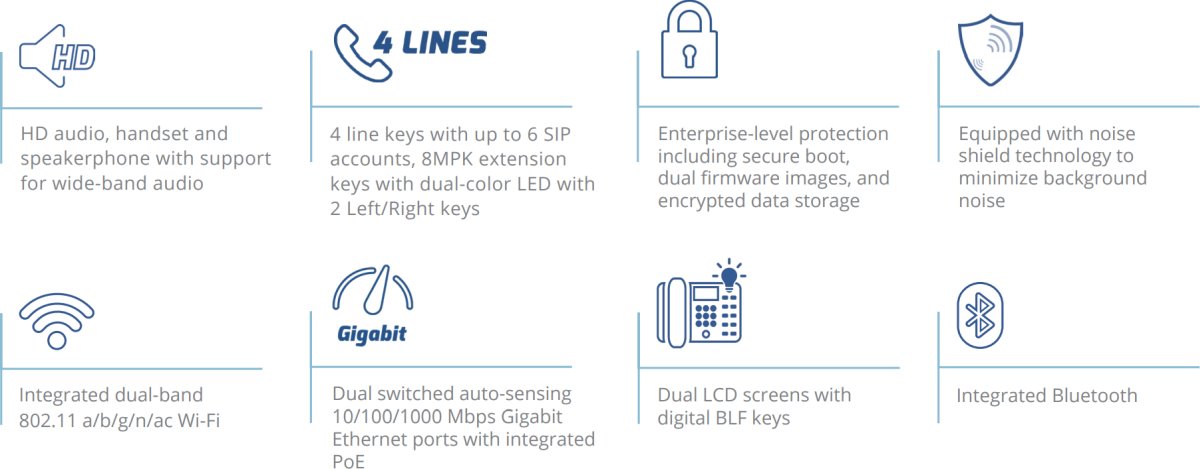 • 4 клавиша за линии с до 6 SIP акаунта, 8MPK клавиша за разширение с двуцветен LED и 2 клавиша за ляво/десно