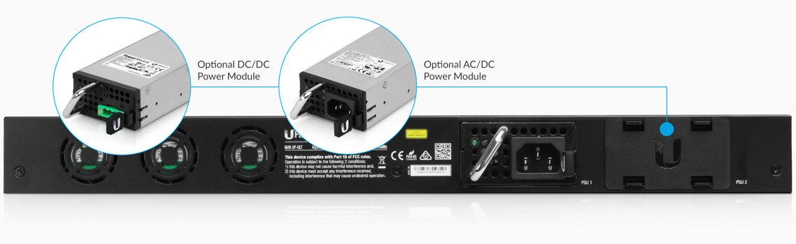 UF-OLT се доставя стандартно с един AC / DC захранващ модул и едно свободно отделение за другия захранващ модул. Този вал може да бъде снабден със същия AC/DC или DC/DC модул, вижте свързаните продукти.